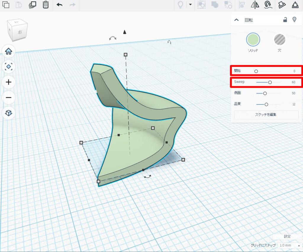 回転図形の開始角度とスイープ角度を設定できます。