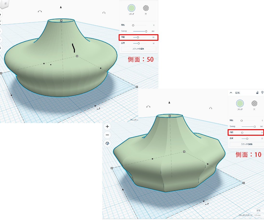 側面は回転体の辺数を設定します。数値が大きいほど滑らかな曲面になります。